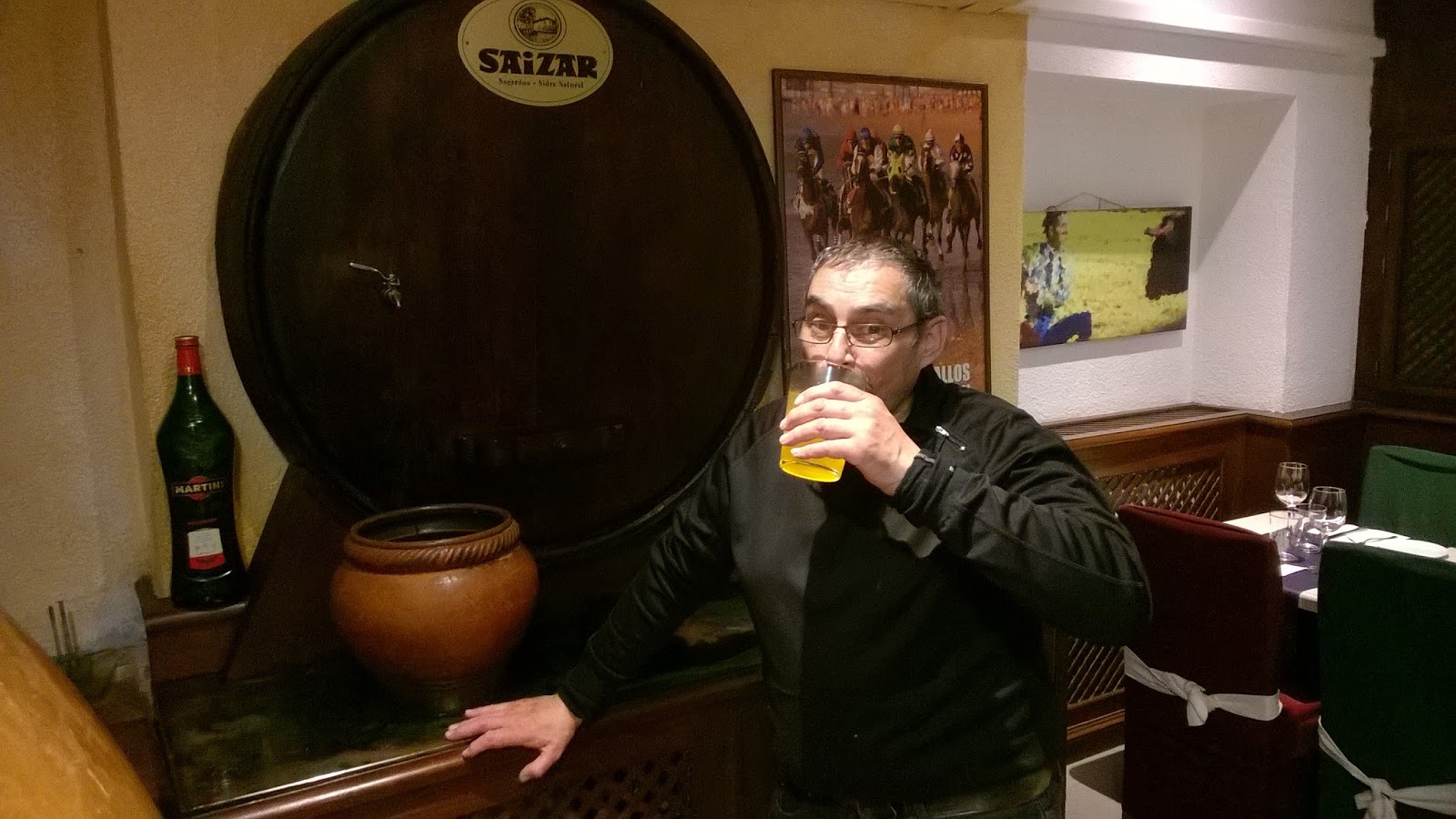 Now thoroughly fed up, our bikes were determined to ignore the directions of the sat nav and, with what I swear was a throaty chuckles and sideways glance between them, they deposited us in the middle of the pedestrian precinct alongside a police car, the occupant of which wound his window down and, in a stern voice with a perfect command of English, demanded if he could help us. It appears being lost must be against the law as Xavier the policeman insisted on giving us an escort to our lost hotel and watching over our kit and bikes while we unloaded into the accommodation a hundred yards away. Not satisfied, he felt it necessary to give us some wonderful restaurant advice and so a short while later we deposited ourselves at Aralar and in front of the largest vat of local scrumpy I had ever tried to ring dry.